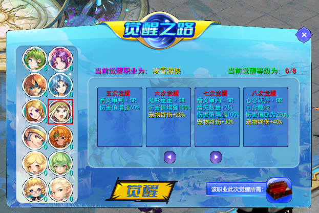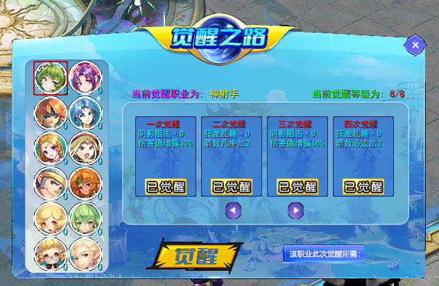 觉醒之路内共有12个职业可觉醒,每个职业觉醒可觉醒八次